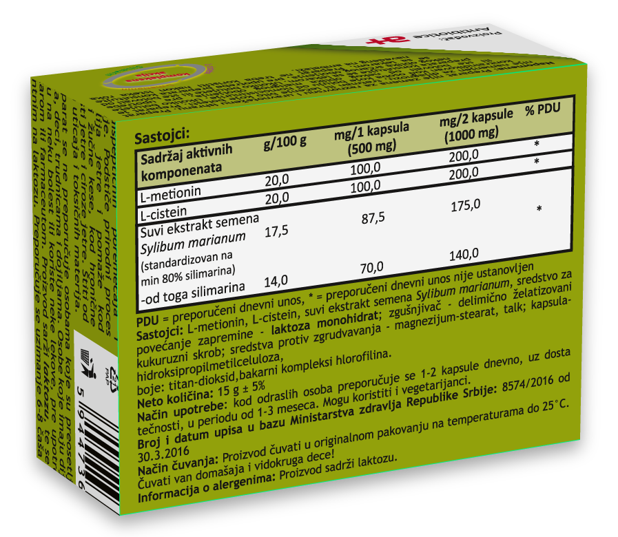 - Jedinstvena kombinacija sa 2 aminokiseline i silimarina » kompleksno delovanje koje se javlja u obe faze detoksikacije jetre