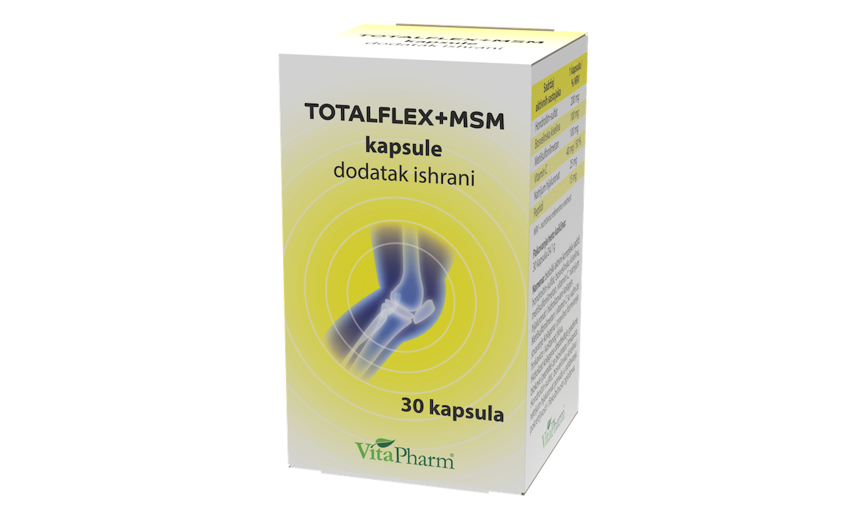 Sinergistički efekat sastojaka TOTALFLEX+MSM kapsula utiče na ublažavanje bola, smanjenje otoka i ukočenosti kod svih zglobova u organizmu, podstiče efikasnu regeneraciju tkiva hrskavice, kao očuvanje ili povratak fizioloških pokreta zglobova.Značajno utiče i na usporenje nastajanja novih oštećenja, naročito kod osoba sklonih nastanku hroničnih reumatoidnih oboljenja